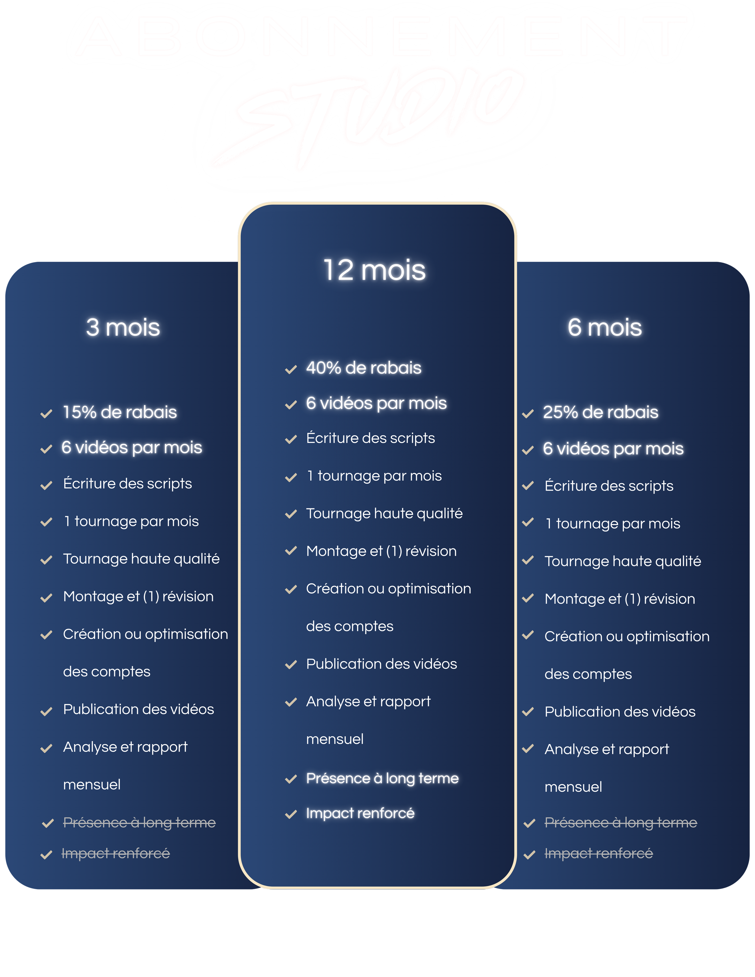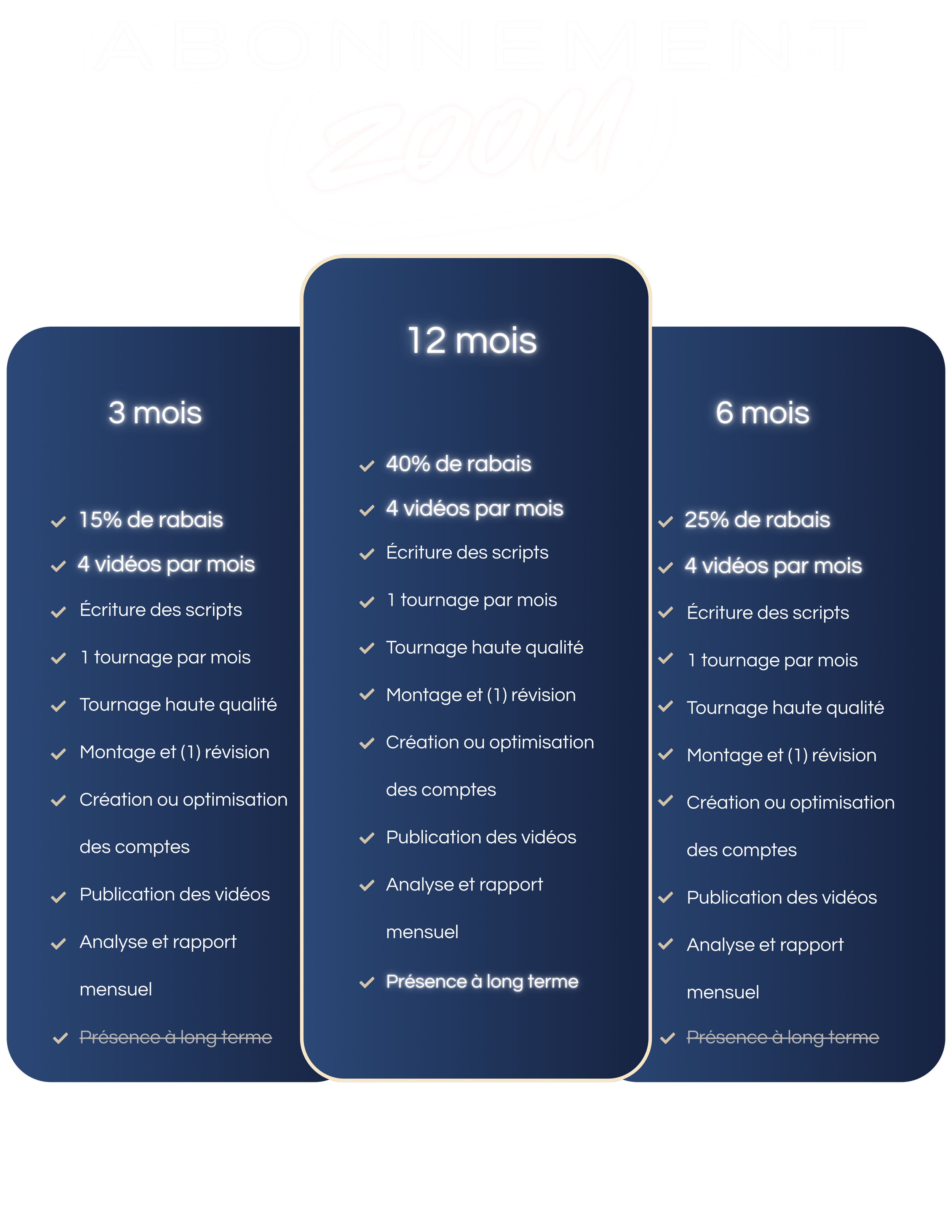 Cet abonnement est spécialement conçu pour les entreprises saisonnières. Il permet de maintenir une présence en ligne minimale pendant la saison active, tout en profitant des avantages de la création de contenu professionnel. L’objectif est de bâtir une audience, créer de l’impact dans votre domaine d’expertise, augmenter votre notoriété et convertir des clients potentiels.
